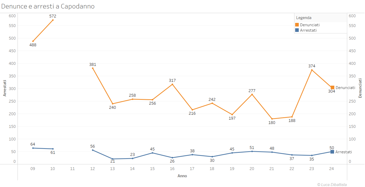 Il grafico sottostante mostra in arancione (linea alta) le persone che sono state denunciate per azioni illecite relative ai botti di Capodanno. In blu (linea bassa), invece, sono indicati gli arresti.