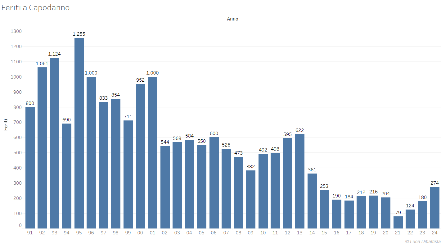 Il seguente grafico mostra quanti sono stati i feriti a causa dei botti di Capodanno dal 1991 al 2024.